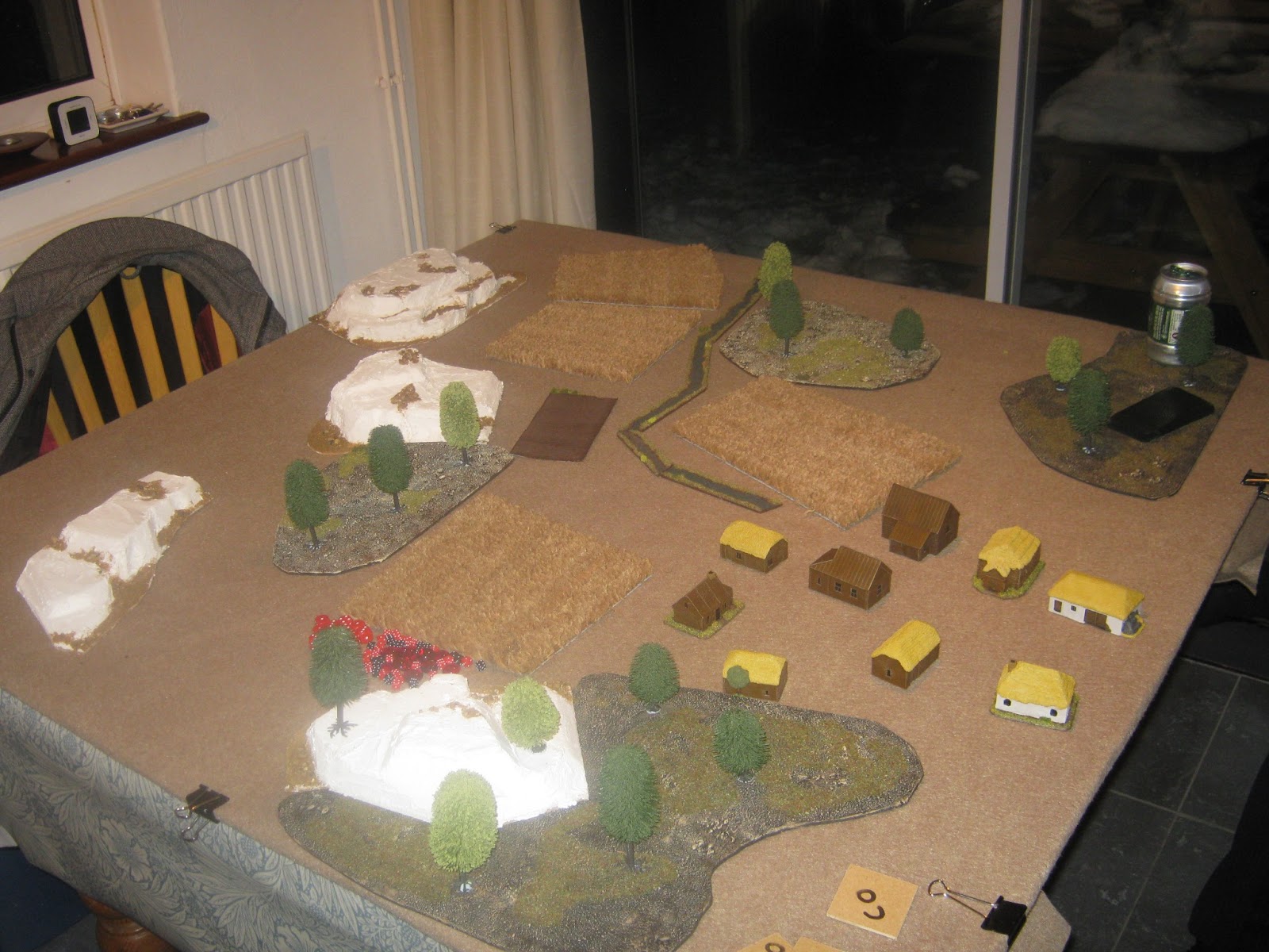 The table looked great. the door matt fields fitted right in at the 10mm scale and considering they took 5 minutes to cut up and cost £5 totally exceeded expectations. May well cut one or two of them in half again for a bit more flexibility in organising them. Ed's N Guage trees look great (I got mine through the mail today) but I will be making some smaller mdf bases for them to stand on to suplement the large area 28mm scale ones I used last night (I think you need a lot of small pieces of scenery for 10mm). Special shout out to General Sutov for bringing along a stream and finishing off painting his entire village, lovely work mate. I will be cutting some base boards to stand buildings on just so it's clear when stands are in built up areas, but plan to leave the buildings free standing so we can mess about with arrangement add/remove as required. Hills are good, about the right size. At first when I laid out the scenery the table felt very cluttered but in game it seemed to work OK, allowing for Russian manoeuvres but forcing extra command checks as units transitioned between terrain types.Rules
